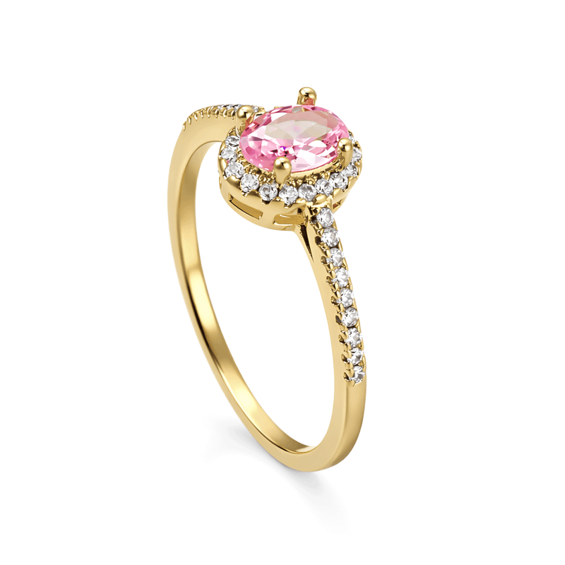Anel Zircônia Oval Rosa e Aro Cravejado em Banho de Ouro 18K