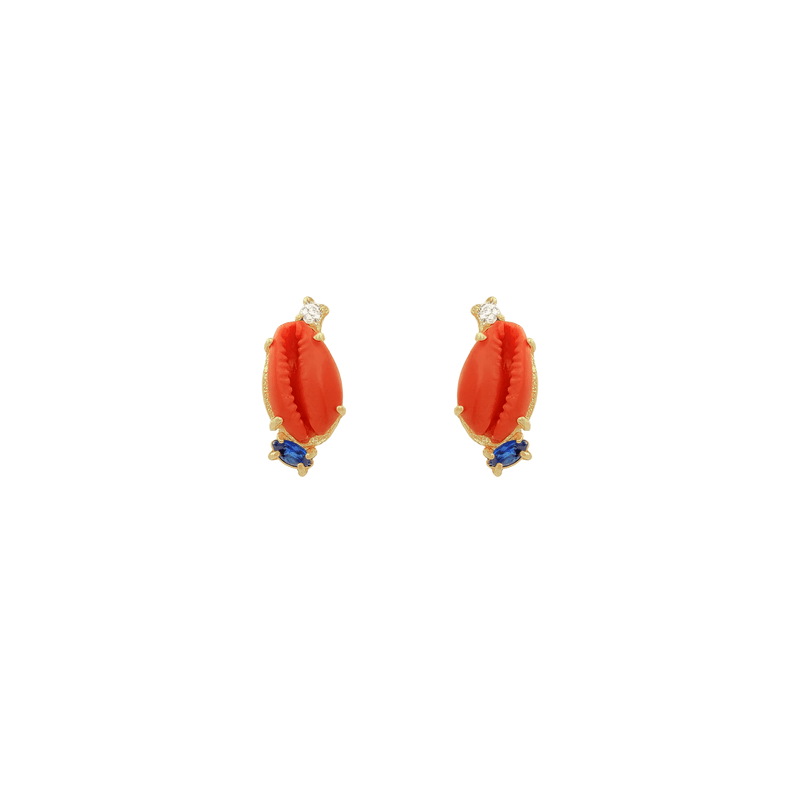 Brinco em Banho de Ouro 18k Búzios Resina Coral com Zircônias - PL12454
