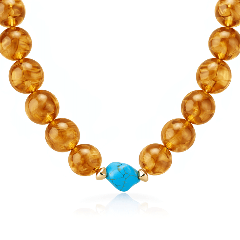 Colar Bolas Marmorizadas Marrom e Pedra Turquesa