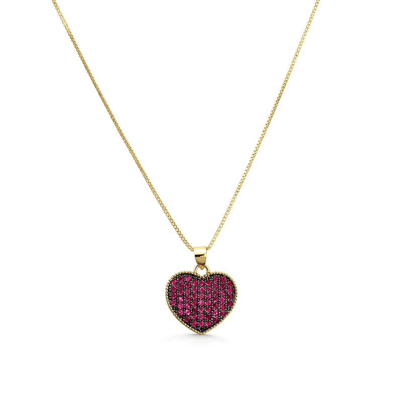 Colar Coração Cravejado Rosa em Banho de Ouro 18K