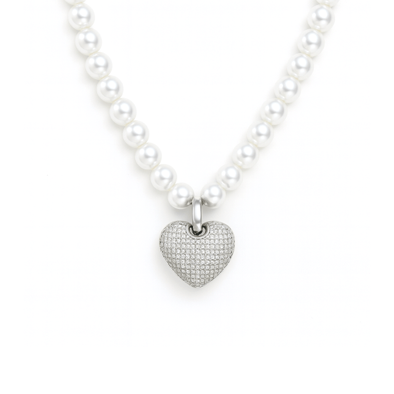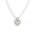 Colar de Pérolas e Coração Cravejado em Banho de Ródio