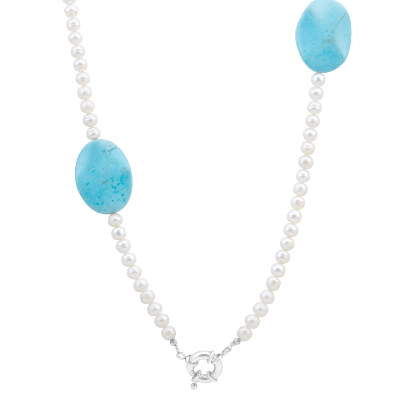 Colar Pedra Natural Turquesa e Pérola Biwa em Prata 925