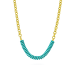 O colar com pedras turquesa em banho de Ouro 18K é uma joia vibrante e elegante, que combina a energia marcante da turquesa com o brilho sofisticado do ouro. As pedras em tom azul intenso trazem frescor e leveza ao design, enquanto o banho de ouro confere um toque luxuoso e atemporal. Versátil e cheio de estilo, é perfeito para compor produções modernas e descontraídas, adicionando cor e sofisticação a qualquer look.