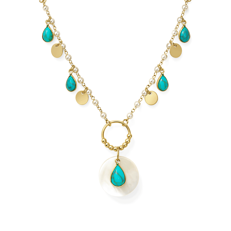 Colar Pérolas e Gotas Pedra Turquesa em Banho de Ouro 18K
