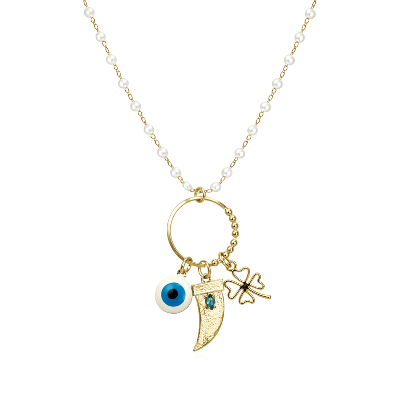 Colar Pérolas Olho Grego e Trevo em Banho de Ouro 18K