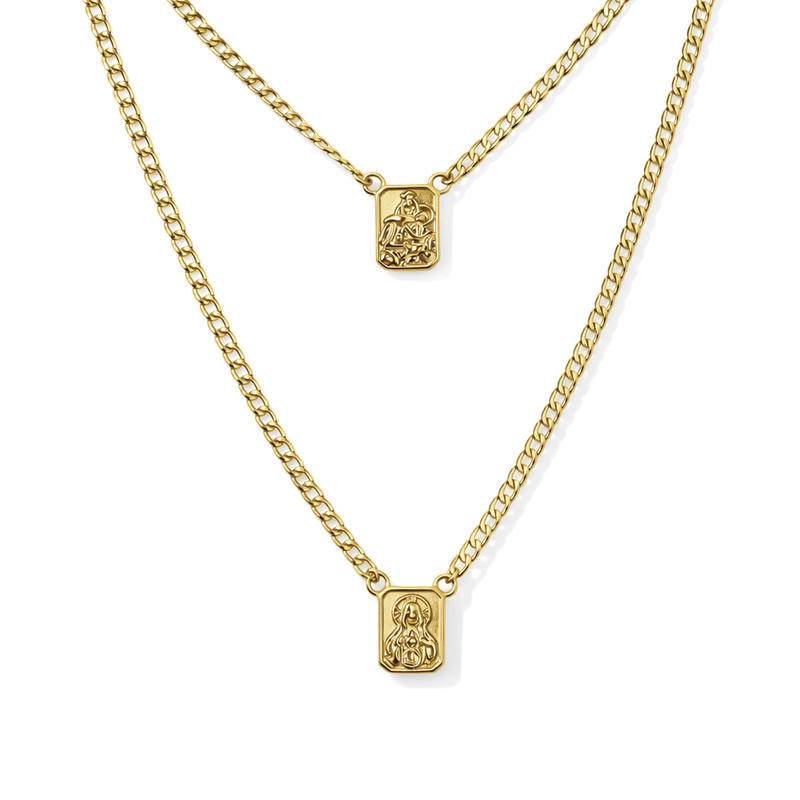 O Escapulário Sagrado Coração e Senhora das Graças em Banho de Ouro 18K é uma joia repleta de fé, proteção e significado espiritual. Com medalhas delicadamente trabalhadas representando o Sagrado Coração de Jesus e Nossa Senhora das Graças, a peça simboliza amor, devoção e amparo. O banho de ouro 18 quilates garante acabamento luxuoso, brilho intenso e excelente durabilidade, valorizando cada detalhe do design. Elegante e atemporal, é ideal para uso diário, expressando fé com sofisticação e estilo.